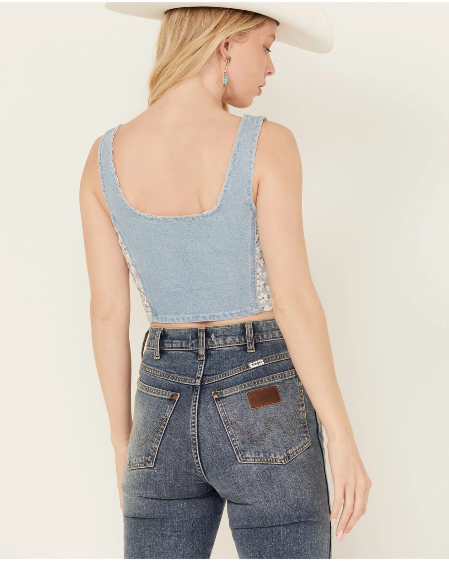POL Women’s Medium Wash Denim Floral Print Sleeveless Corset Tank