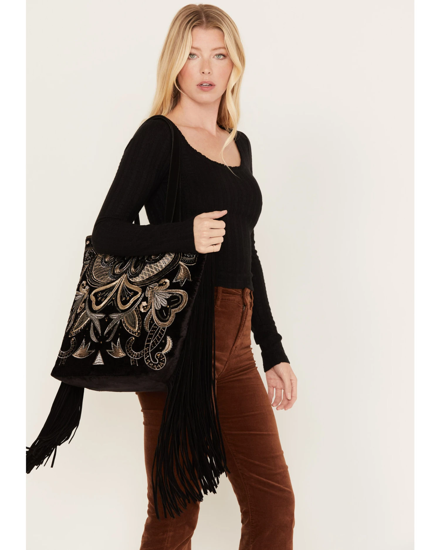 Shyanne Women’s Velvet Embroidered Beaded & Fringe Tote Handbag
