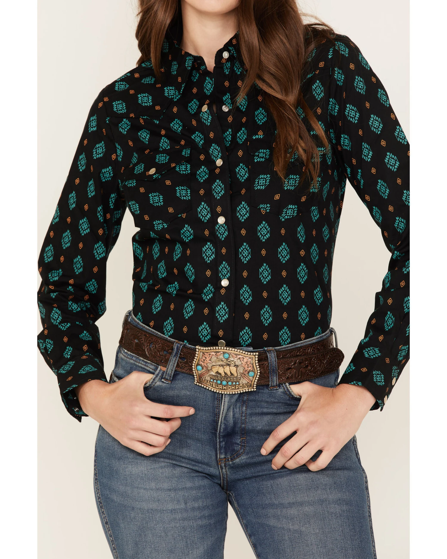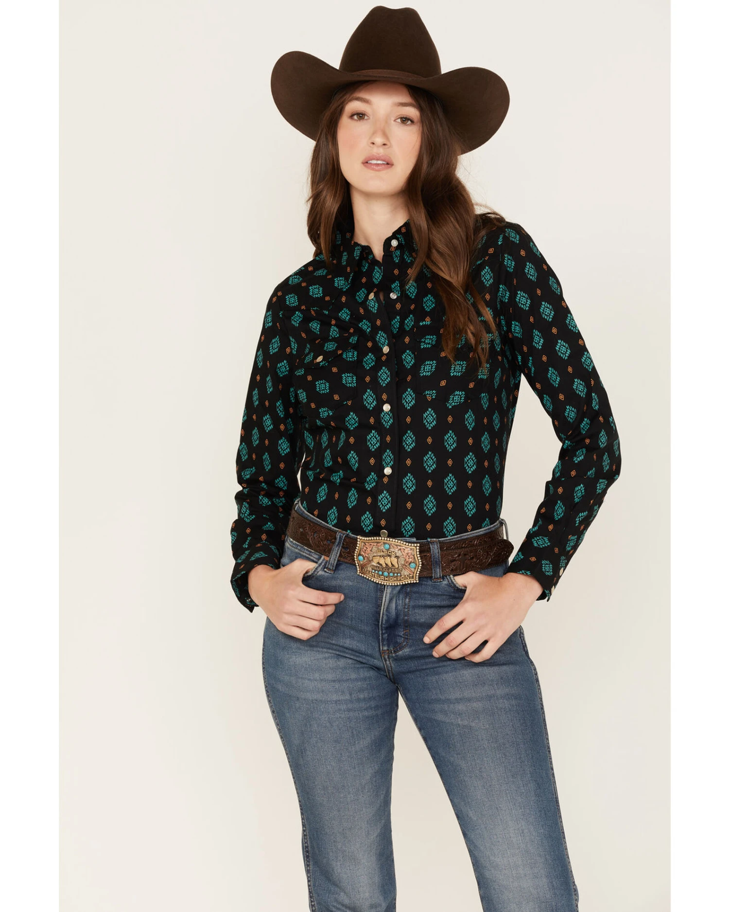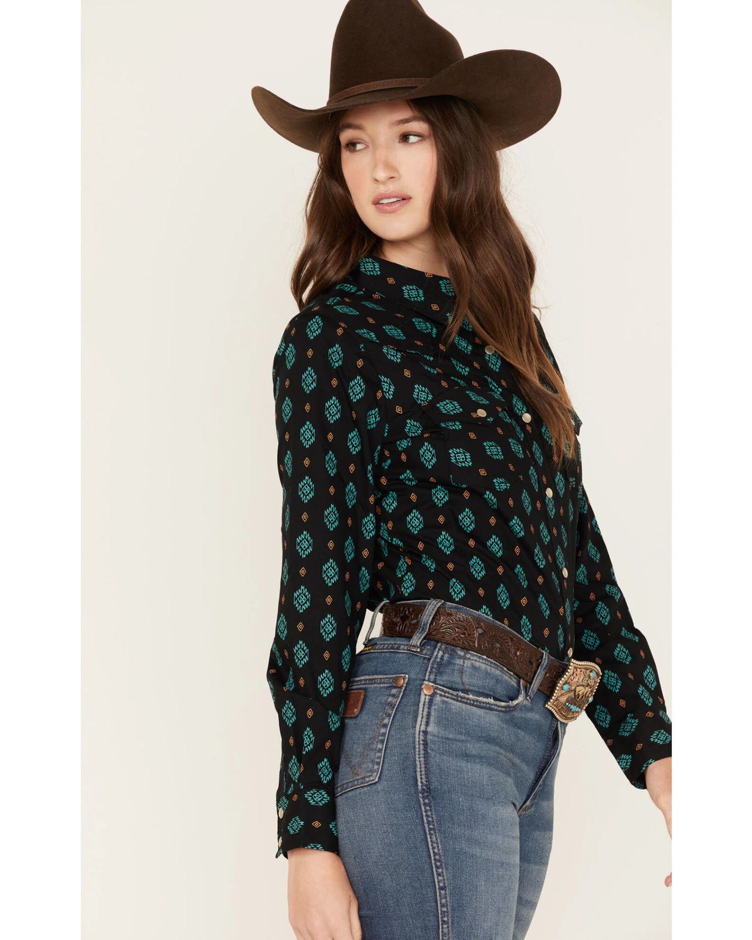 Wrangler Women’s Southwestern Geo Print Long Sleeve Snap Western Shirt